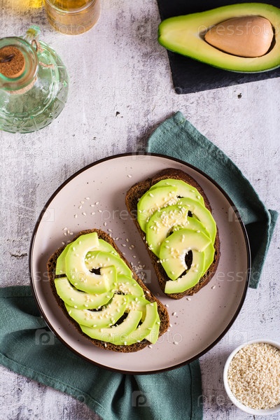 Брускетта с авокадо и кунжутом на ржаном хлебе на тарелке. Здоровая пища. Сверху и по вертикали