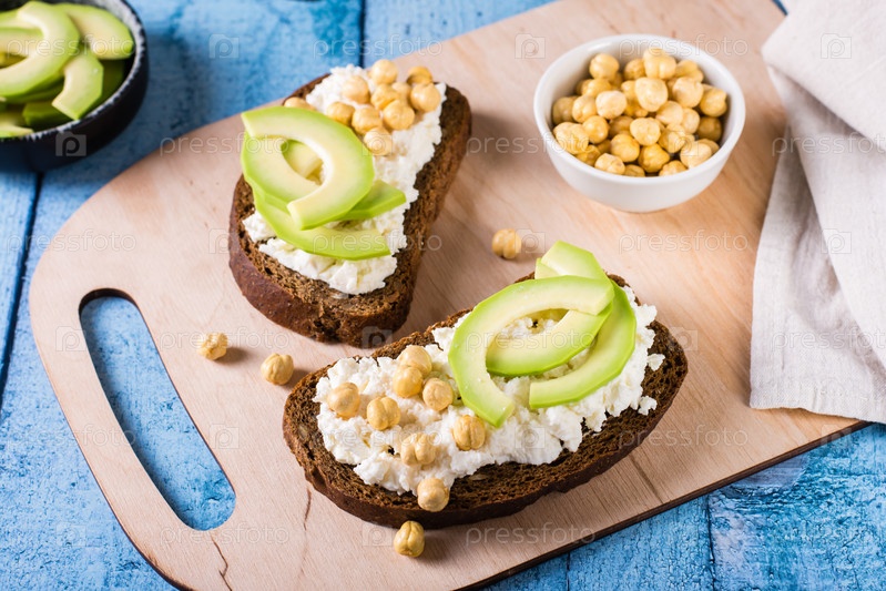 Брускетта с рикоттой, авокадо и нутом на ржаном тосте на доске. Здоровая пища