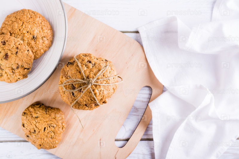 Стопка домашнего овсяного печенья с изюмом, перевязанного ниткой на доске. Здоровая выпечка. Вид сверху