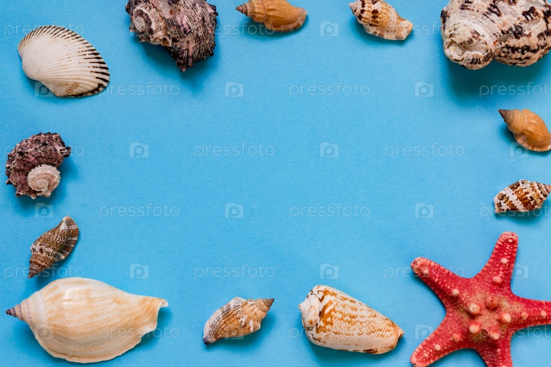 Морские раковины и морские звезды на голубом фоне с копировальным пространством. концепция летнего отдыха и отпуска