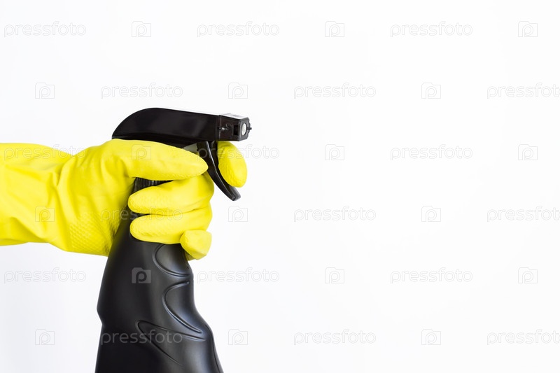 Рука в розовой резиновой перчатке держит черную пластиковую бутылку с моющим средством. Бытовая химия. Чистящее средство