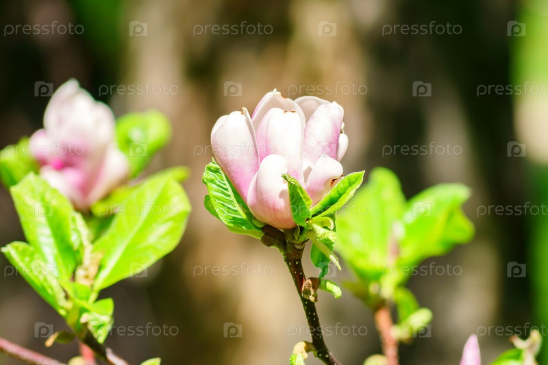 Красивый цветущий розовый цветок магнолии в лучах солнца на фоне зеленого сада