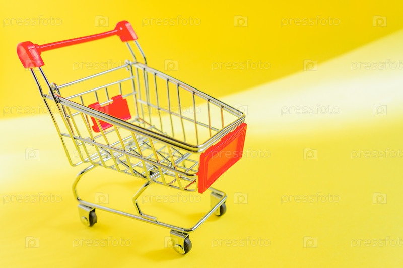 Тележка для покупок на желтом фоне с копией пространства. Стиль минимализм. Креативный дизайн