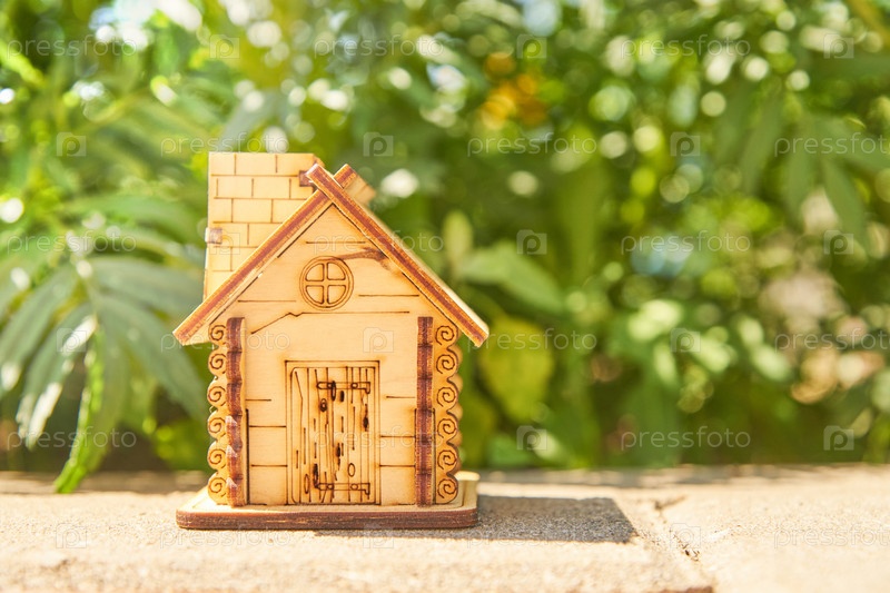 Мини-игрушка деревянный дом на фоне летней природы. концепция ипотеки, строительства, аренды, использования в качестве концепции семьи и собственности. копировать пространство