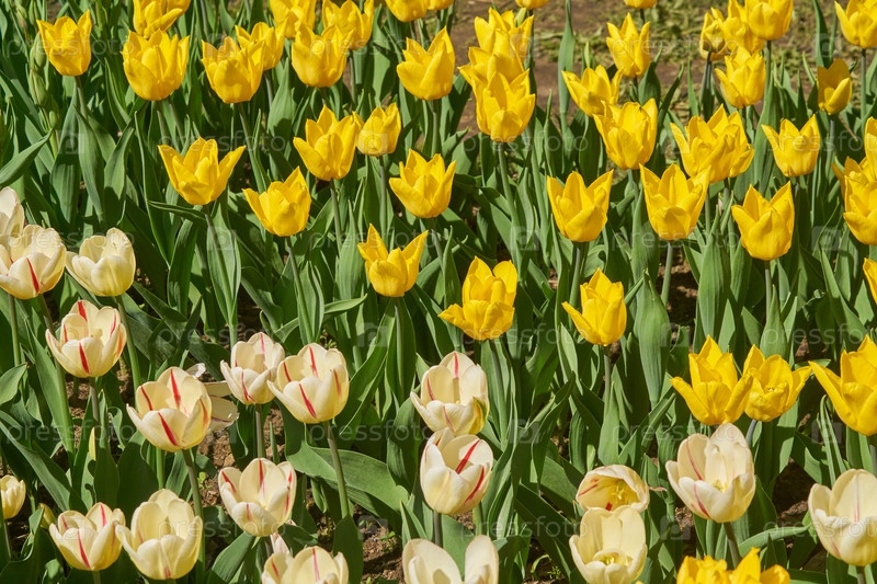 Красивые поля белых и желтых тюльпанов весной, естественный фон