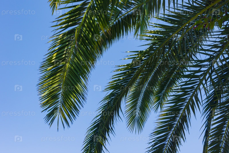 Зеленые ветви пальм на фоне голубого неба - концепция фона и отдыха
