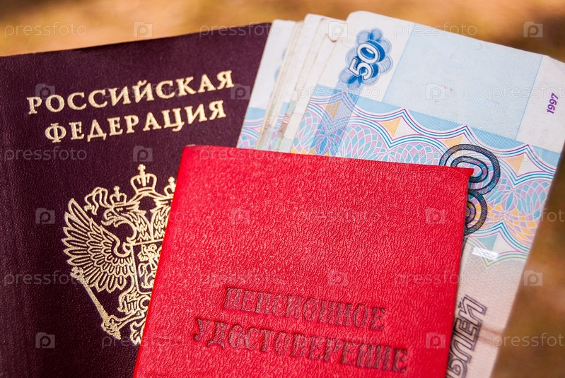 Российский паспорт, пенсионное удостоверение и деньги-русский перевод: пенсионное удостоверение