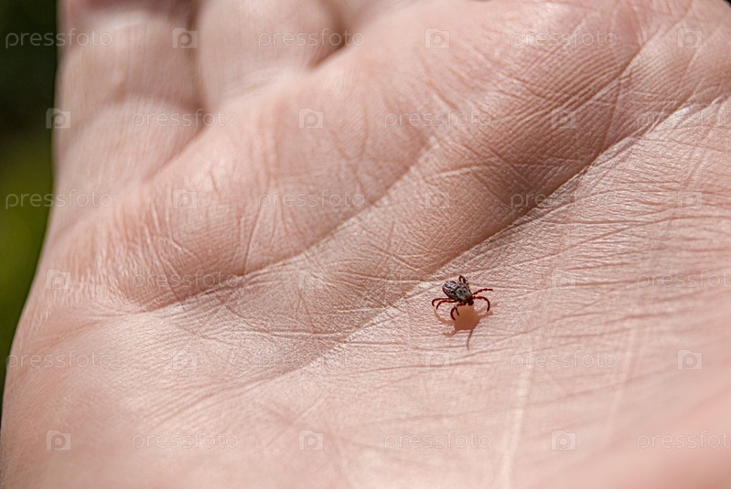 Клещ Ixodes ricinus ползет по коже человека. энцефалитический клеща. этот вид животных является носителем боррелия
