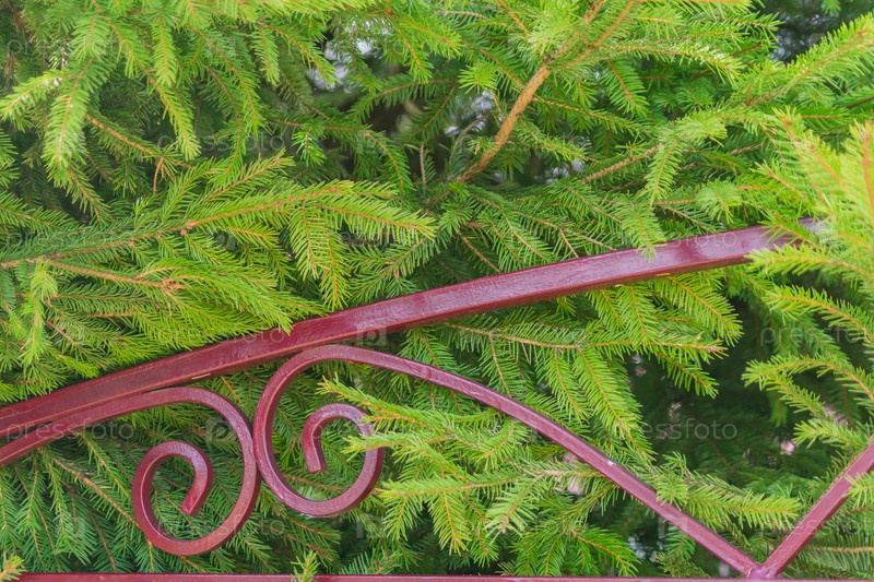 Фоновая текстура зеленой ветки ели. Пушистая молодая ветка Ель за металлическим забором