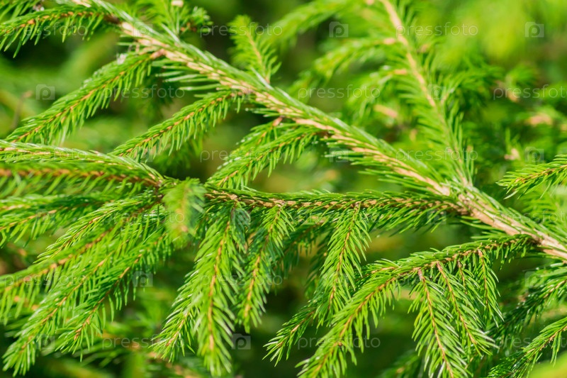 Фоновая текстура зеленой ветки ели. Пушистая молодая ветка ели