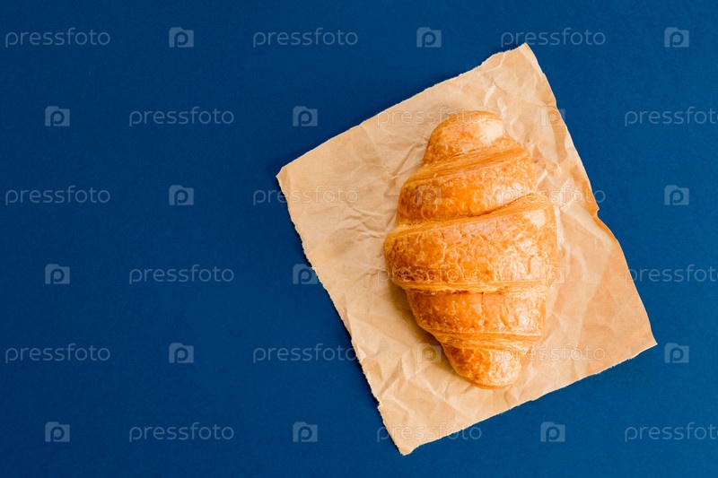 Вид сверху на круассан на крафт-бумаге на синем фоне с копировальным пространством