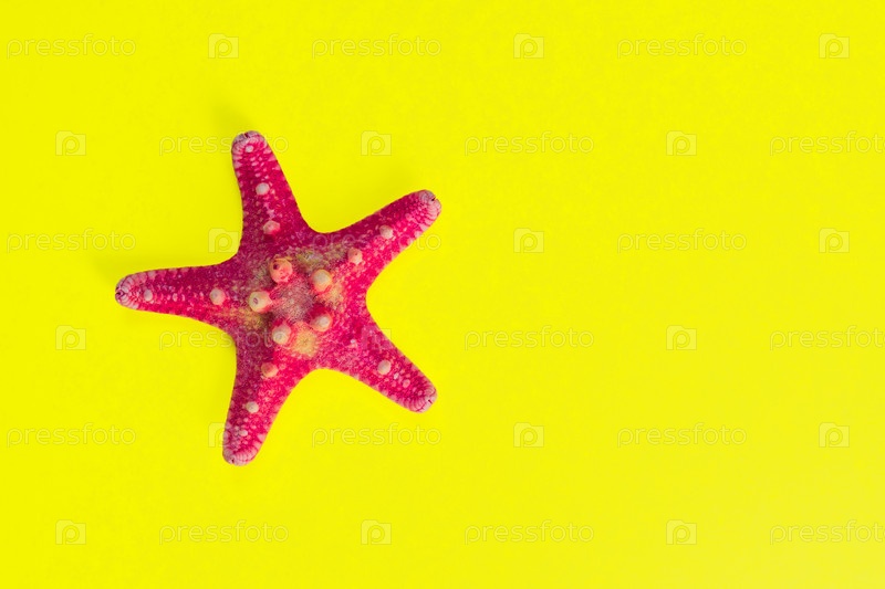 Красная морская звезда на светло-желтом фоне с копией пространства. концепция летнего отдыха и отпуска