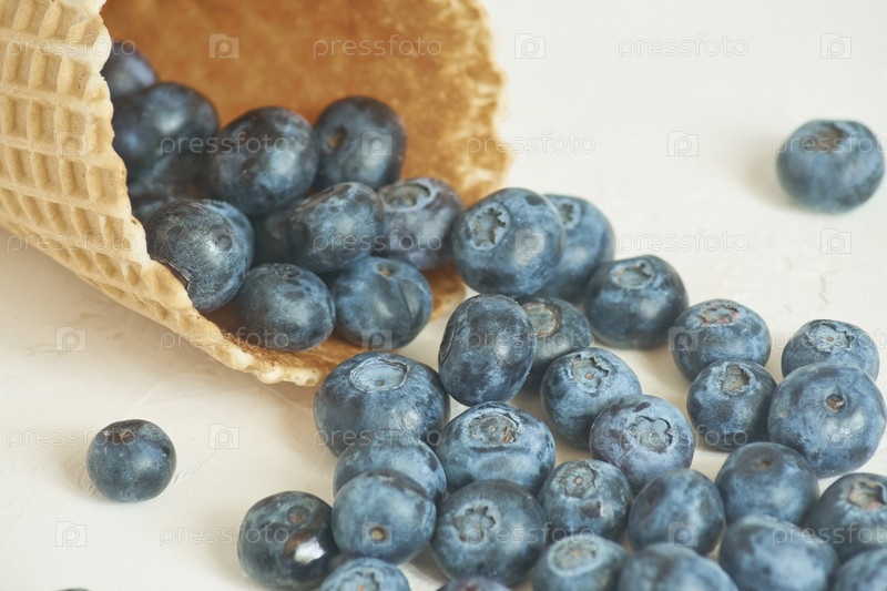 Крупным планом вафельный рожок с черникой на белом бетонном фоне с копировальным пространством