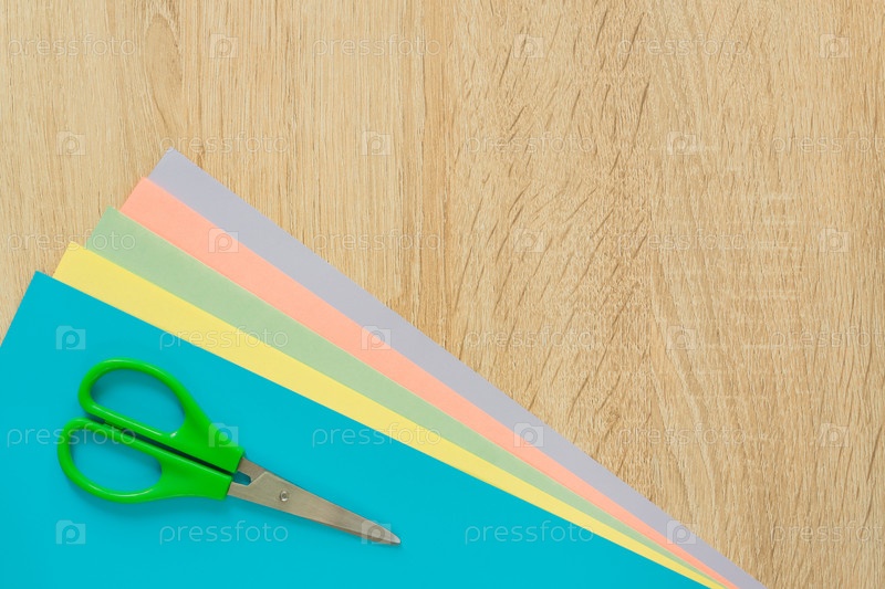 Вид сверху на разноцветную бумагу и ножницы на деревянном столе. Вид сверху. Организация творческой работы или ремесла