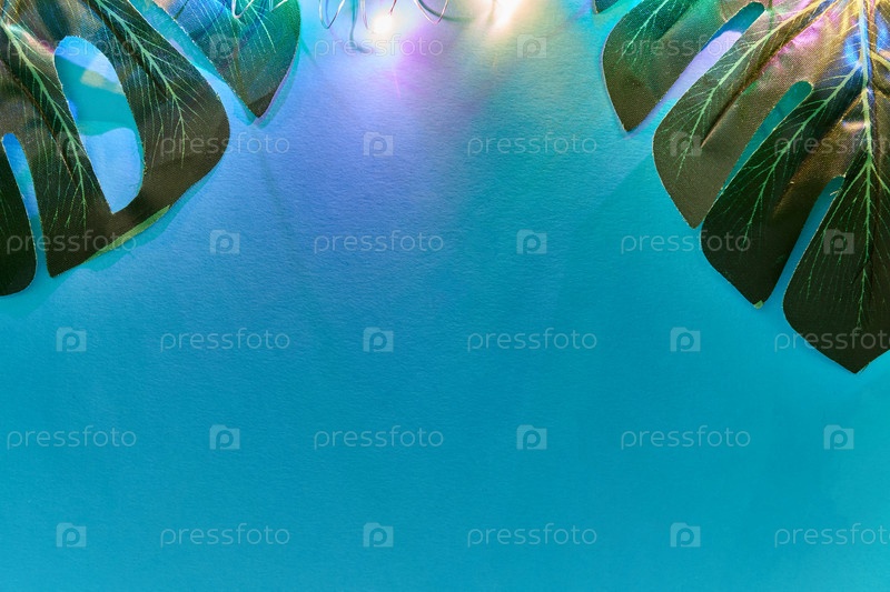 Зеленые листья монстера на синем фоне с неоновой светодиодной подсветкой. Модный тропический фон для ваших проектов