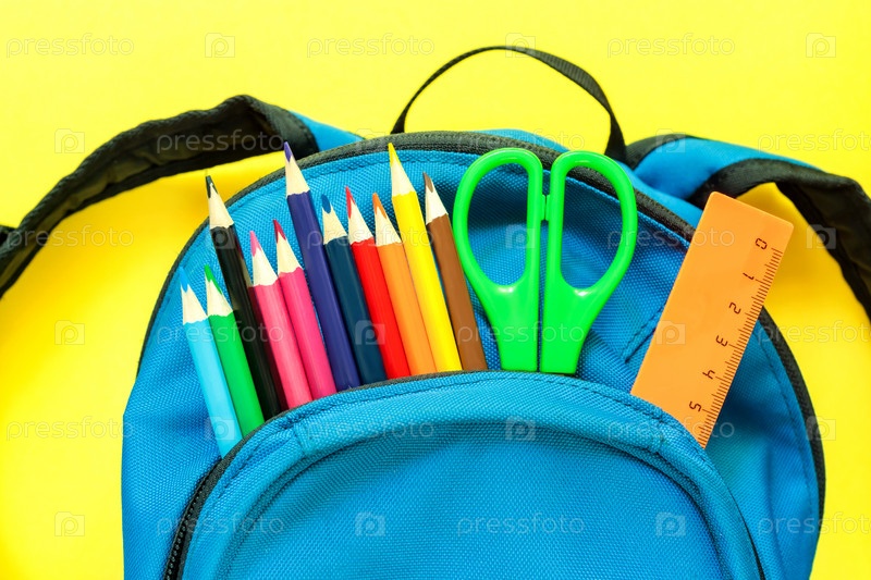 Синий рюкзак с различными красочными канцелярскими принадлежностями на желтом фоне. Обратно в школу
