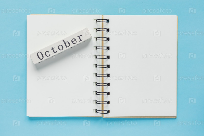 Чистая спиральная записная книжка для заметок и сообщений и октябрьская деревянная полоса календаря на синем фоне. Минимальная деловая планировка