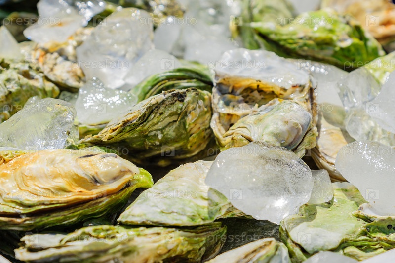 Много свежих закрытых устриц на льду. Закрыть. Рынок морепродуктов