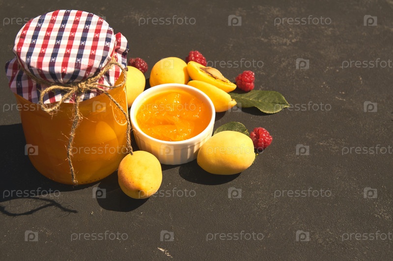 Банка с домашним органическим абрикосовым джемом и спелыми абрикосами и малиной на черном фоне. Скопируйте место для вашего текста