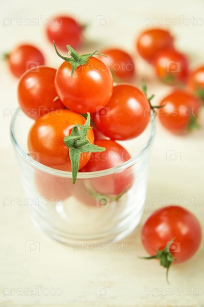 Свежие помидоры черри на белом деревянном столе. Органические овощи, здоровая и диетическая пища, мягкий фокус