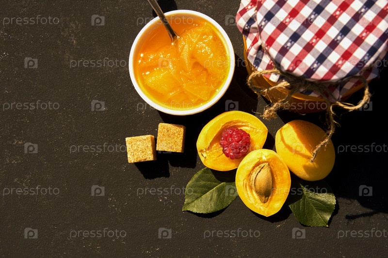 Вид сверху на банку с домашним органическим абрикосовым джемом и спелыми абрикосами и малиной на черном фоне. Скопируйте место для вашего текста