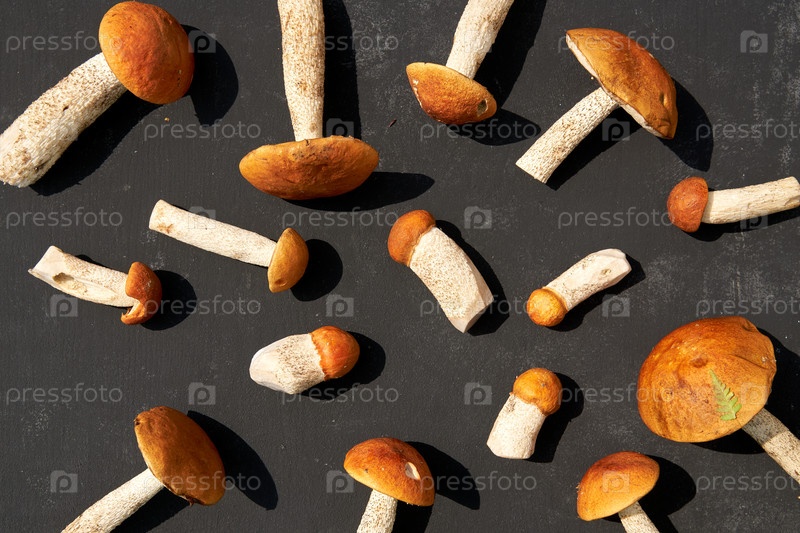 Подберезовик Оранжевые грибы в ряд на темном фоне. Концепция природы, окружающей среды и съедобных грибов с копировальным пространством. Вид сверху, плоская планировка