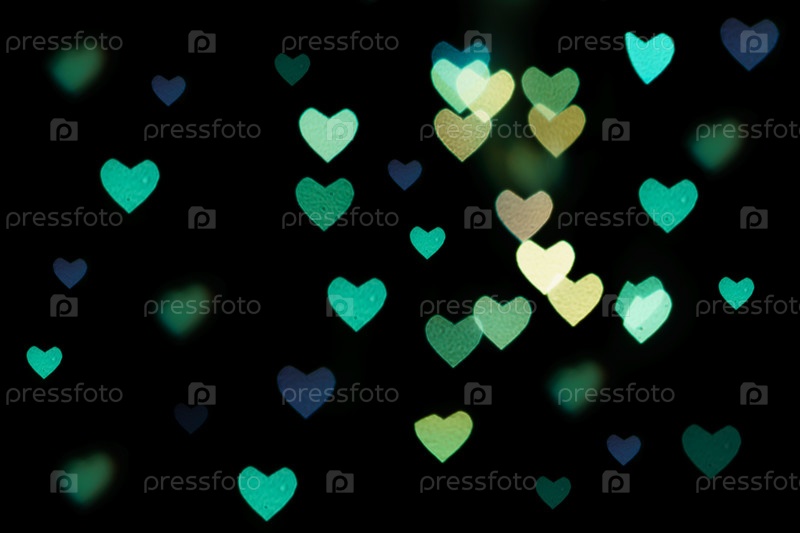 Боке разноцветных сердец синего цвета на черном фоне. Текстура для праздников