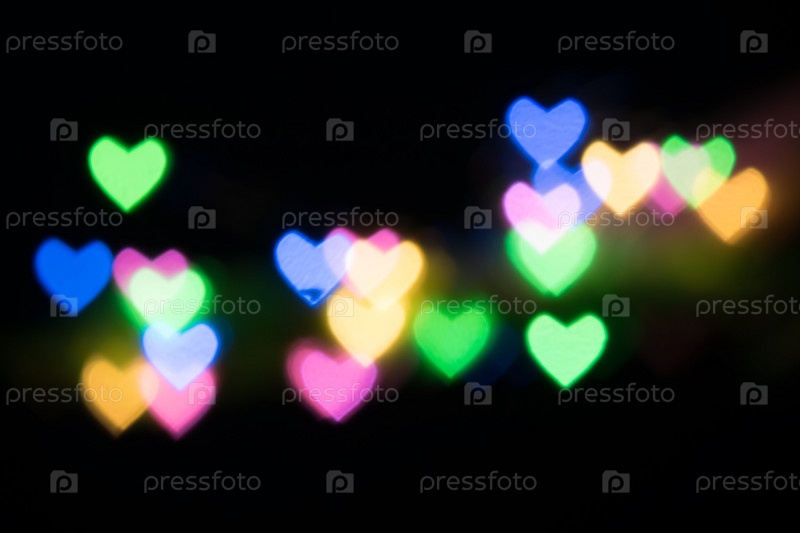 Боке разноцветных сердец синего, зеленого, розового и оранжевого цветов на черном фоне. Текстура для праздников