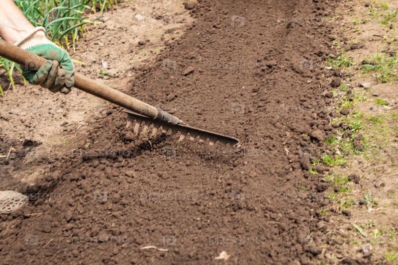 Подготовка грядок к посадке после зимы. граблями рыхлили и разровняли землю на грядках