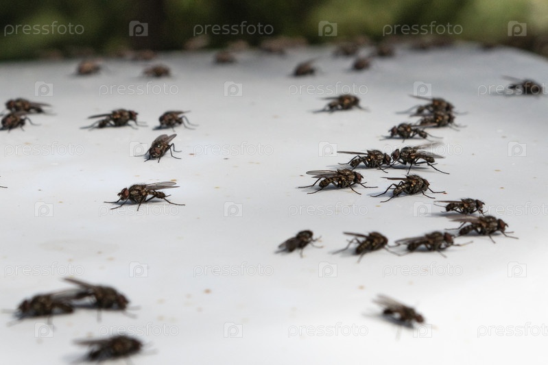 Мухи Musca domestica, сидящие на белой поверхности. в крупном плане