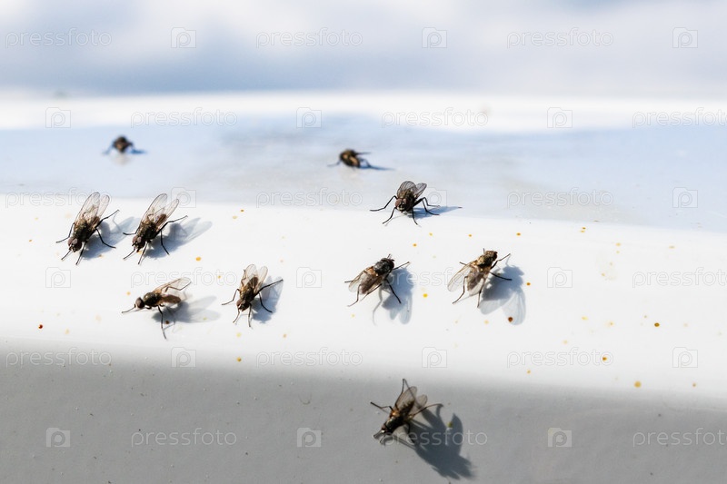 Мухи Musca domestica, сидящие на белой поверхности. в крупном плане