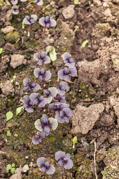 Пурпурный базилик прорастает в теплице. на участке растет зелень, капуста, салат, базилик