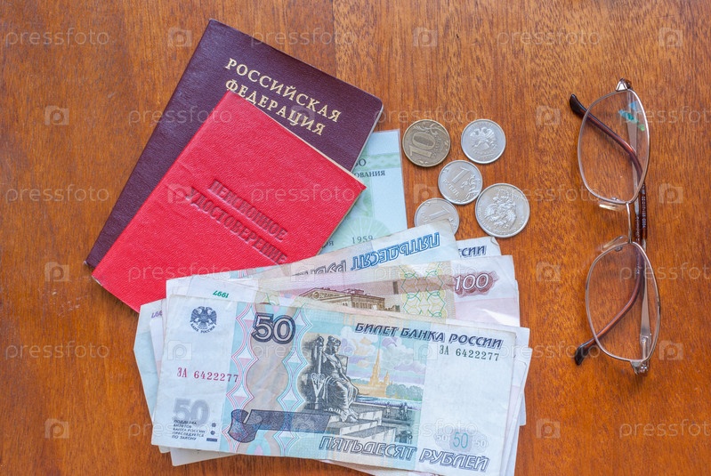Деньги, очки и пенсионное удостоверение на деревянной поверхности - русский перевод: российский пенсионный фонд. пенсионное удостоверение
