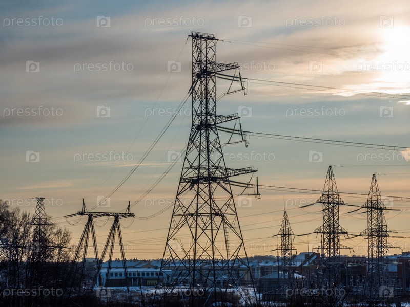 Высоковольтная линия электропередач на фоне голубого неба