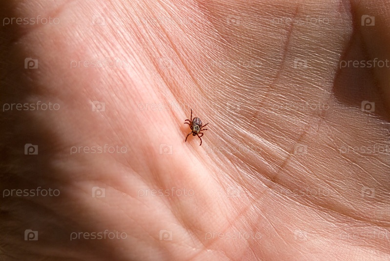 Клещ Ixodes ricinus ползет по коже человека. энцефалитический клеща. этот вид животных является носителем боррелия