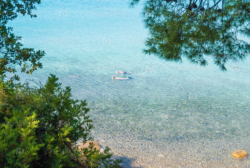 Солнечный красивый летний вид на песчаный пляж с греческим голубым морем с мелкой чистой водой и небольшими скалами. Халкидики Греция