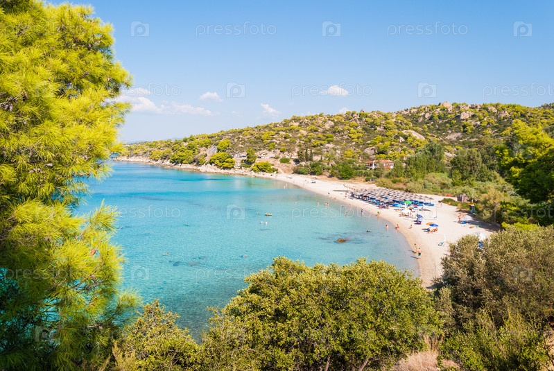 Солнечный красивый летний вид на песчаный пляж с греческим голубым морем с мелкой чистой водой и небольшими скалами. Халкидики Греция