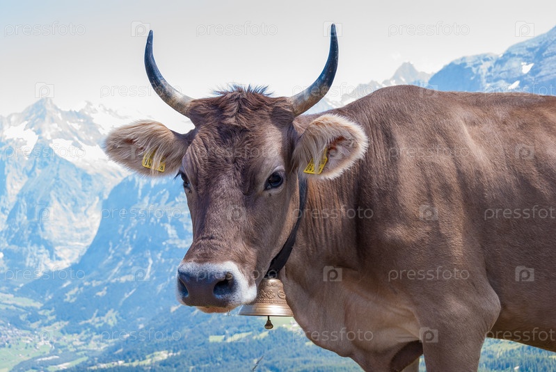 Корова на горном пастбище в швейцарских Альпах. крупным планом