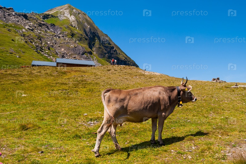 Корова на горном пастбище в швейцарских Альпах