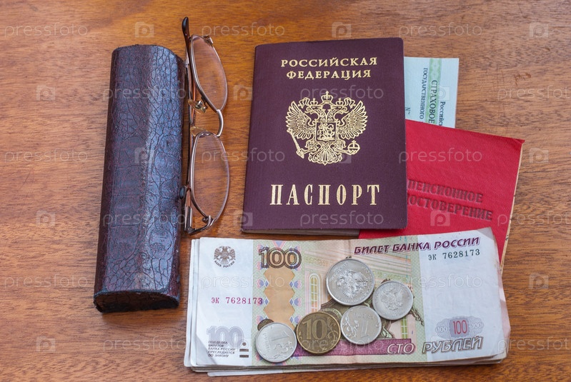 Деньги, баллы и пенсионное удостоверение на деревянной поверхности-перевод на русский язык: пенсионное удостоверение