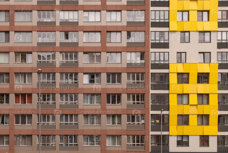 Современный многоквартирный дом с красочными фасадами на окраине города. Жилой комплекс «В лесу», Москва, Россия