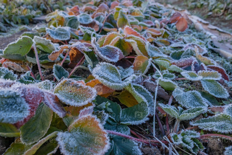 Морозное ноябрьское утро. красно-зеленые и желто-розовые листья клубники покрыты белым льдом. крупным планом