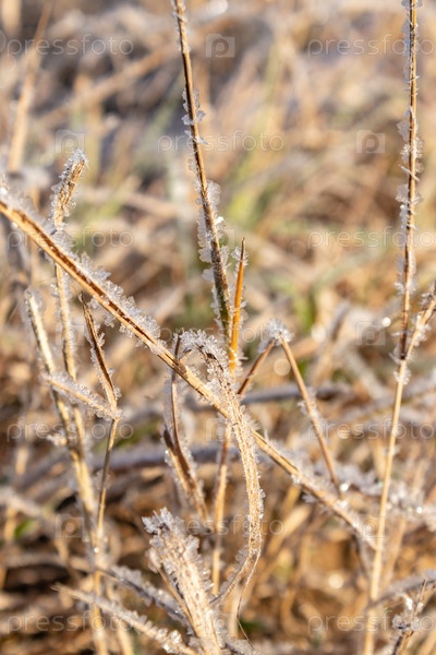 Первый мороз осенью на траве. Солнечное утро после морозной ночи, времена года. крупный план, фон природы