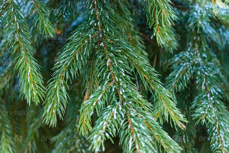 Ветки ели обыкновенной покрыты утренним инеем на естественном фоне. крупным планом