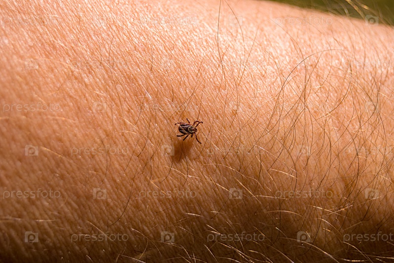 Клещ Ixodes ricinus ползет по коже человека. энцефалитический клеща. этот вид животных является носителем боррелия