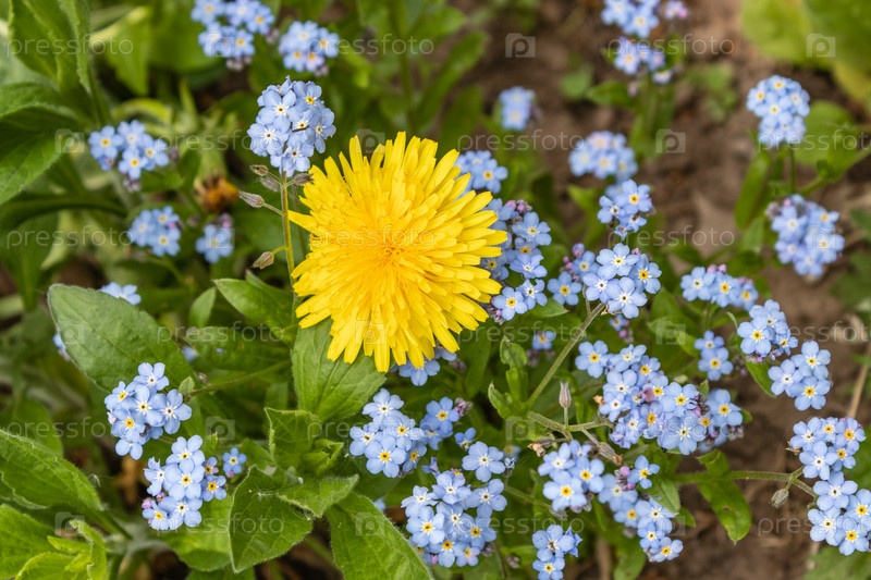 Нежные голубые незабудки и желтые одуванчики на весеннем лугу. Прекрасный весенний солнечный день