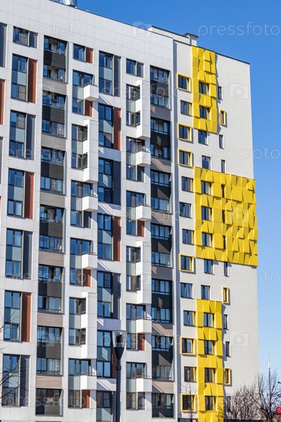 Современный многоквартирный дом с красочными фасадами на окраине города. Жилой комплекс «В лесу», Москва, Россия