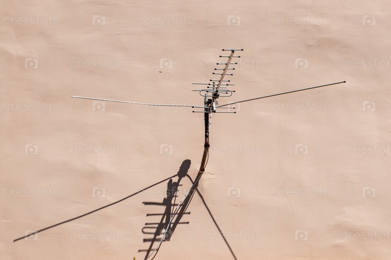 Антенна приемника ТВ-сигнала крепится на стене дома. Эфирное аналоговое телевидение. Переключитесь на цифровое вещание. Тульская область, Россия