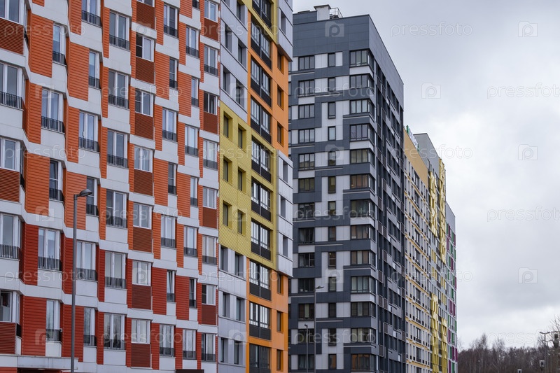 Современный многоквартирный дом с красочными фасадами на окраине города. Жилой комплекс «В лесу», Москва, Россия