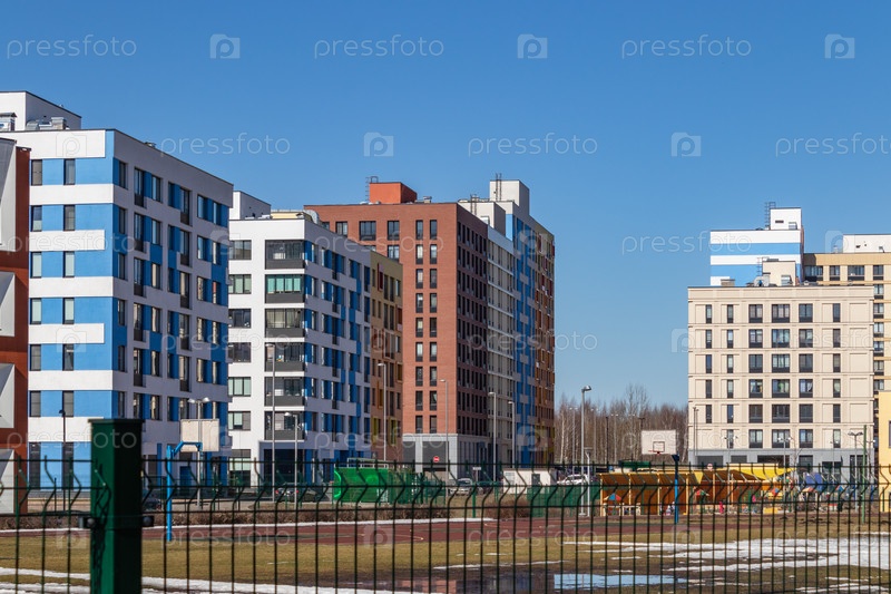 Современный многоквартирный дом с красочными фасадами на окраине города. Жилой комплекс «В лесу», Москва, Россия